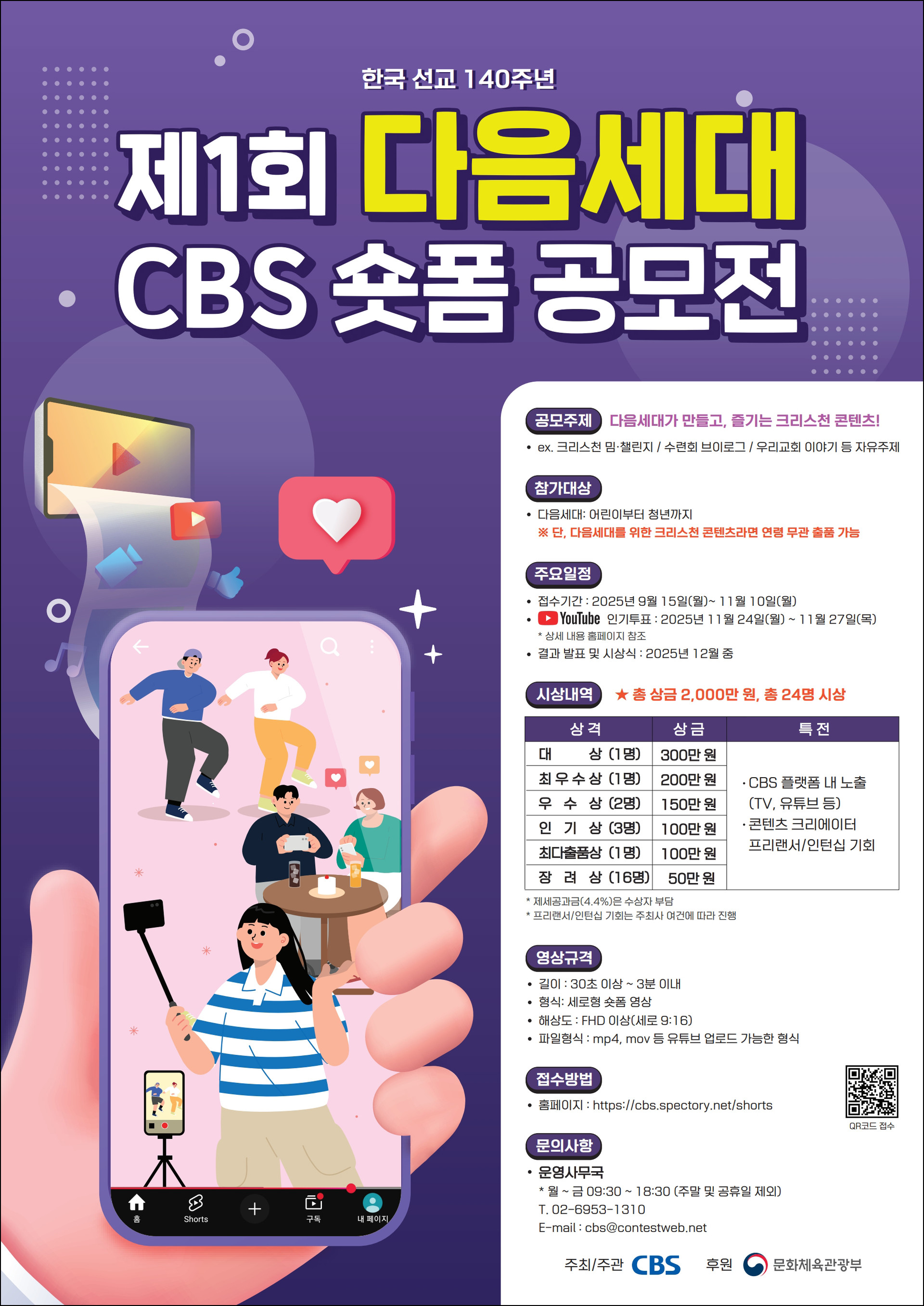 CBS가 한국 선교 140주년을 맞아, 향후 140년을 이끌어갈 다음세대를 위한 [숏폼 콘텐츠 공모전]을 개최합니다.