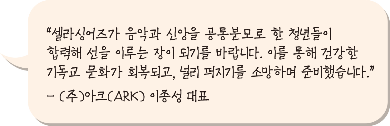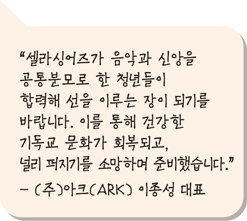 ‘셀라싱어즈’의 주관사인 ‘(주)아크(ARK)’ 이종성 대표는 “‘아크(ARK)’는 인공지능(AI) 의료 헬스케어 전문기업으로, 이번 크리스천 뮤직 페스티벌을 통해 기독교적 가치 확산에 기여하고자 한다”며, “청년 세대의 회복에 대한 비전을 품고 셀라 싱어즈에 헌신하고 싶다”고 말했습니다.