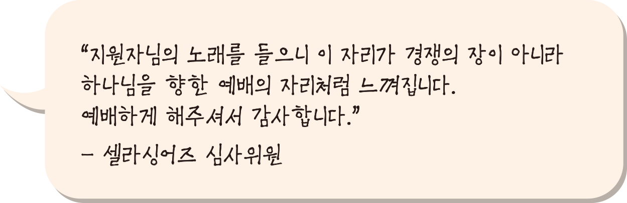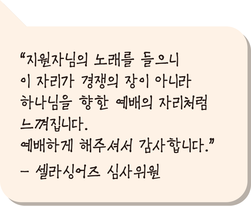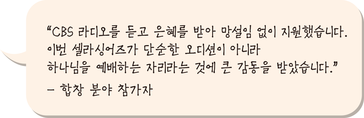 오디션 심사는 CCM 계에서 오랜 경력을 자랑하는 전문가들이 맡았습니다. 심사위원들은 간증과도 같은 참가자들의 노래에 감동을 표현했고, 때론 진심어린 격려로 성장을 응원하기도 했습니다. 참가자와 현장 스태프, 심사위원 모두가 셀라싱어즈에 진심인 만큼 오디션은 아침 일찍 시작해 밤늦게까지 이어지는 열정의 현장이었습니다.