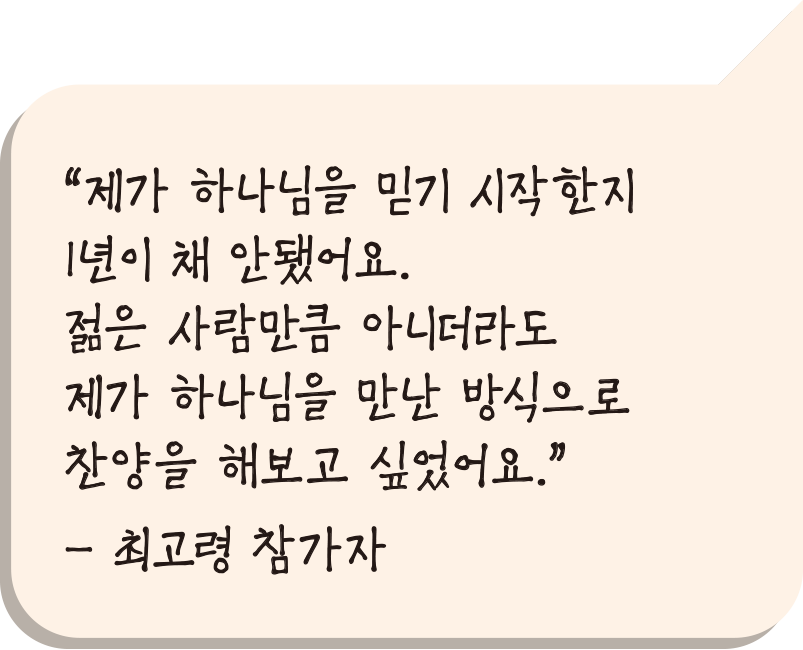 찬양의 ‘장르’도 다채로웠습니다. 에너지 넘치는 힙합부터 연륜이 느껴지는 트로트풍 찬양까지. 그야말로 전 세대가 함께 하나님의 이름을 높이고 있습니다.