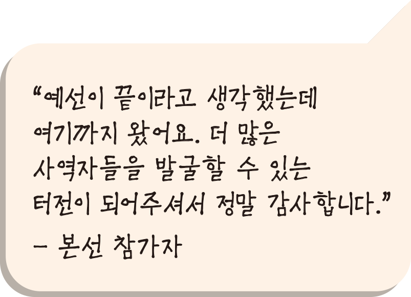 이날 본선에서 선발된 이들은 총 12팀. 오는 11월 29일(금) 감리교신학대학교에서 열릴 결선 무대에 오르게 됩니다. 시간과 열정을 아끼지 않고 전심을 다해 참여하는 본선 참가자들의 모습에 절로 응원이 나왔습니다.