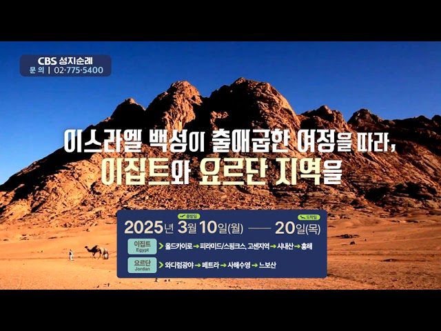 2025년 3월 10일부터 3월 20일까지, 10박 11일간의 특별한 CBS성지순례가 진행됩니다. 3,500년 전 이스라엘 백성의 출애굽 여정을 따라, 이집트와 요르단 지역을 순례합니다.